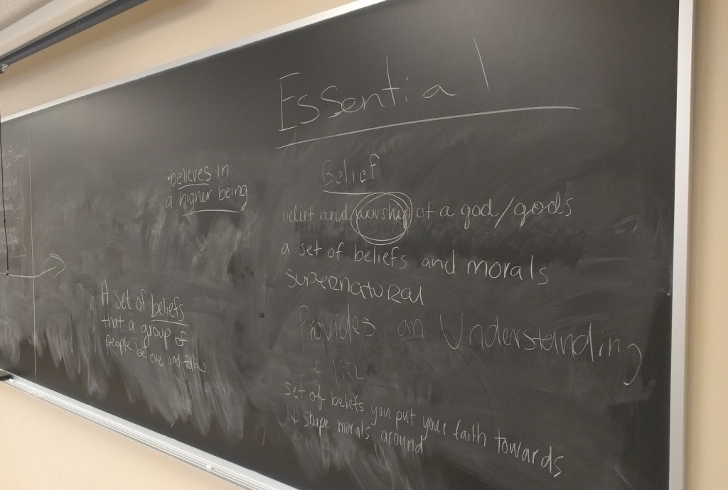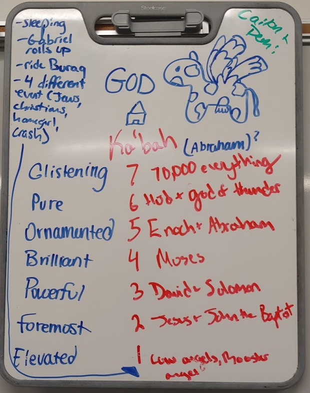 Within the classroom itself, we practice the skills of close, careful reading on multiple occasions throughout the semester. In “Religion in Culture,” for example, we engage in close readings of selections from the Bible and Qur’an, testimonials from Jonestown survivors, and transcripts from a city council meeting in Hamtramck, Michigan. One of the goals of these activities is to get students to set aside what they think they know about Genesis, the Qur’an, Jonestown, or U.S. law and engage with the words on the page. As a class, we read through the passages slowly, discussing translation issues and questions of interpretation. One helpful technique for getting students to slow down as they read is asking them to draw or diagram what they are reading. This technique is particularly effective (and enjoyable) when reading descriptions of Heaven, Hell, supernatural beings, or spiritual journeys.